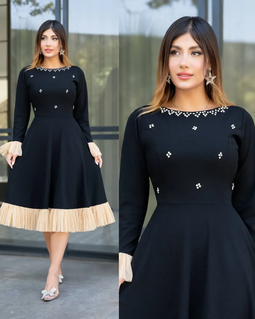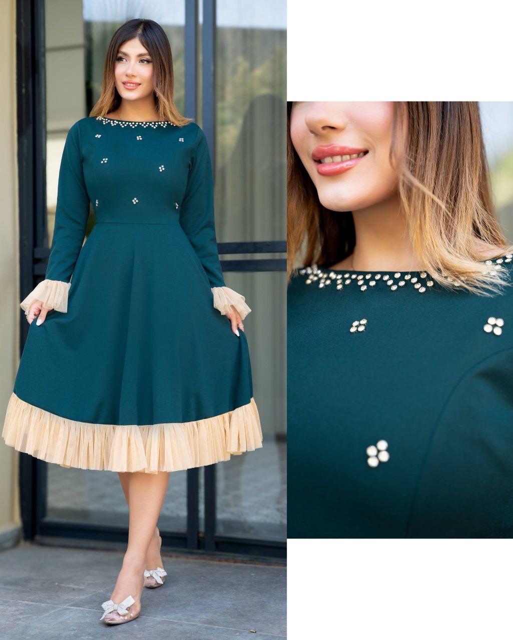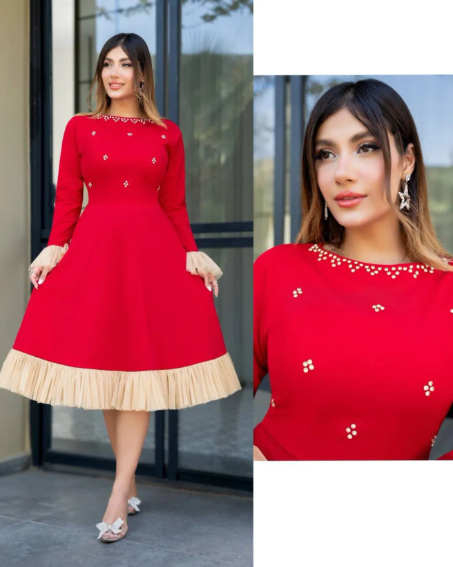 جنس: کرپ دالقیچ و تور. رنگ بندی: قرمز و مشکی و کله غازی. پشت کار زیپ دارد نگین پانچ شده