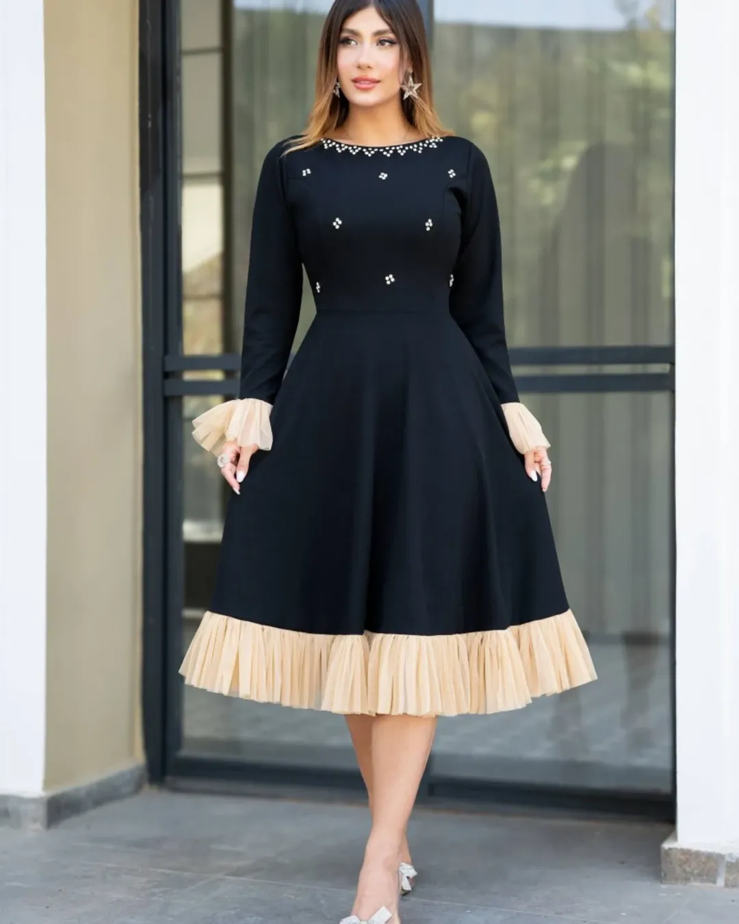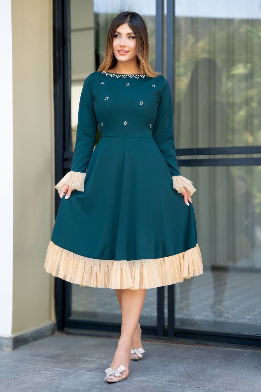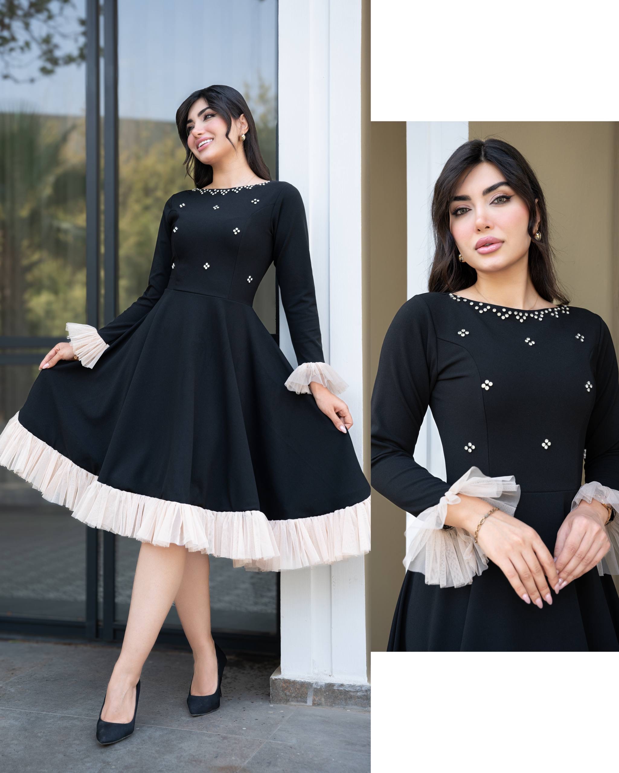 جنس: کرپ دالقیچ و تور. رنگ بندی: قرمز و مشکی و کله غازی. پشت کار زیپ دارد نگین پانچ شده